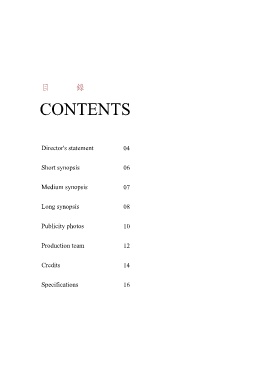 目錄 CONTENTS Director's statement 04 Short synopsis 06 Medium synopsis 07 Long synopsis 08 Publicity photos 10 Production team 12 Credits 14 Specifications 16